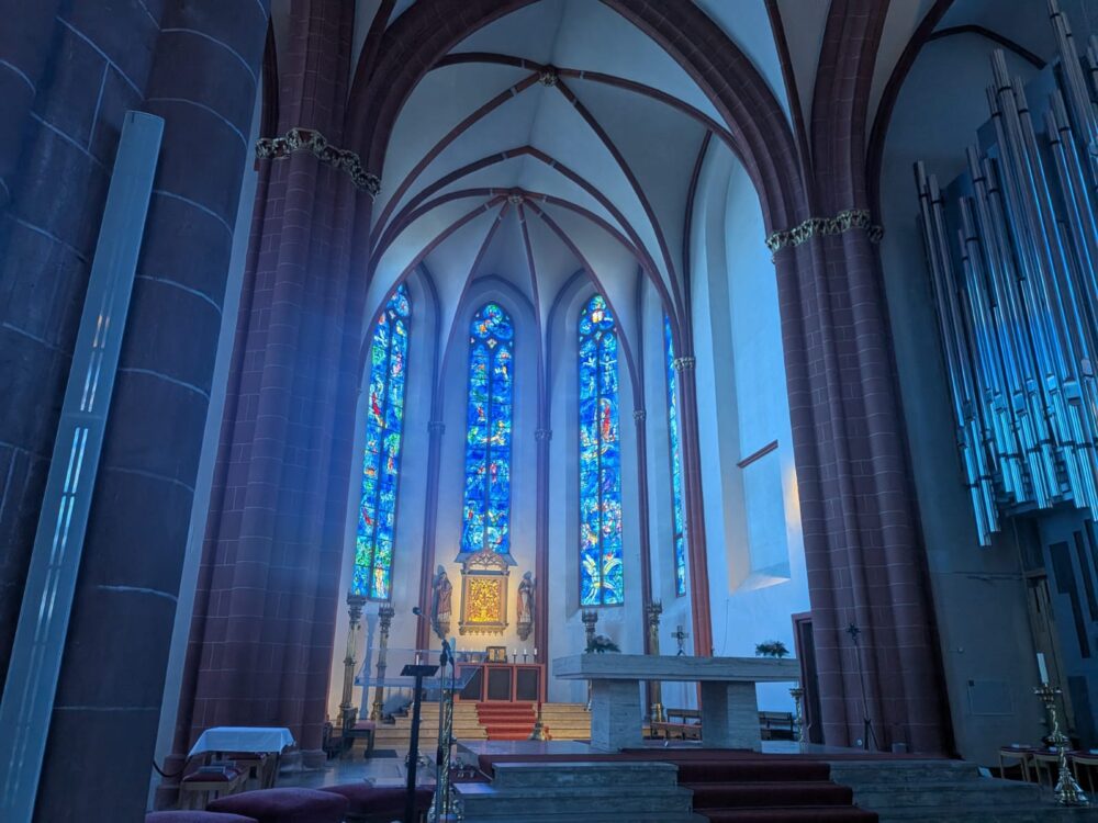 マインツの中心街には、画家のシャガールがデザインした青のステンドグラスに囲まれた教会があるのですが、学会の帰りにこちらにもちょこっと寄り道。この静寂感。圧巻です。美しいですね~。夜は、シンポジウムで一緒に発表した研究者の方々と一緒に晩御飯を食べて、そのままフランクフルトに向かいました。到着は夜中くらいでしたね。